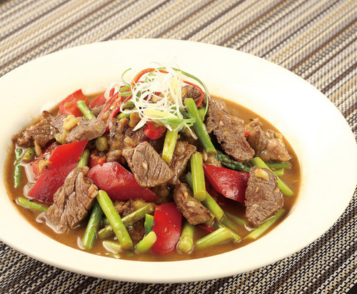 牛肉 200 公克、绿芦笋 1 把、红甜椒 1/3 颗、蒜仁 2 颗、红辣椒 1/3 根、枸杞 1 小匙