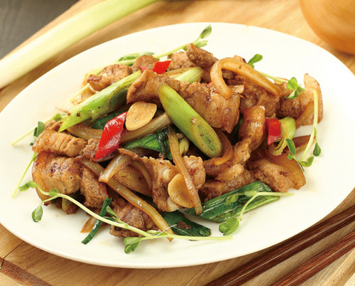 猪五花 300 公克、洋葱 1/2 颗、蒜苗 1 根、红辣椒 1/2 根、 蒜仁 5 颗