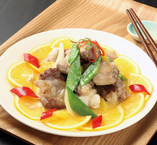 猪小排骨 300 公克、柳橙 1 颗、洋葱 1/2 颗、蒜仁 2 颗、 红辣椒 1/2 根、豌豆荚 10 公克