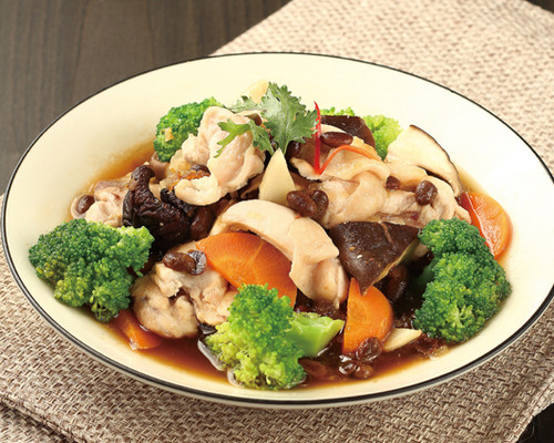 去骨鸡腿肉 1 支、干香菇 3 朵、鲜香菇 2 朵、红萝卜 20公克、姜 10 公克、绿花椰菜 1/3 朵