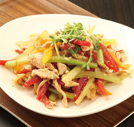 鸡胸肉 1 副、红甜椒 1/2 颗、黄甜椒 1/2 颗、西芹 2 根、 蒜仁 2 颗、红辣椒 1/3 根