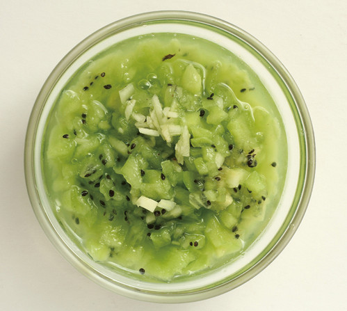 奇异果去皮、切碎末,蒜仁切末与其他材料拌匀即可。