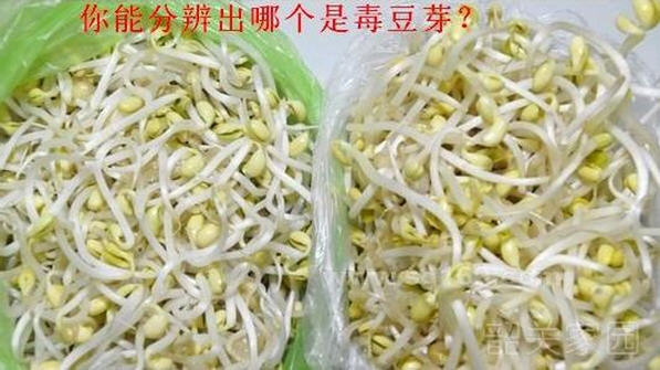 生产豆芽过程中是不允许使用任何添加剂的,而那些小作坊使用了至少4种添加剂,如尿素、激素、生长剂等,加入尿素和6-苄氨基腺嘌呤可使豆芽长得又粗又长,而且可以缩短生产周期,增加黄豆的发芽率。但是人食入后,会在体内产生亚硝酸盐,长期食用可致癌。这就是所谓的“毒豆芽”。此外,无根豆芽素(无根剂)、植物生长调节剂、增粗剂等添加剂均属激素,长期食用会导致各种疾病。