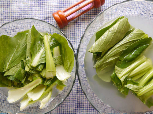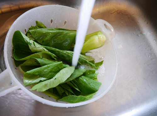 流动清水-要很有耐心唷~叶菜类要一片片剥下来洗干净,先浸后泡效果最佳,浸泡后以流动的清水冲洗久一点,一直到没有泡泡~约15分钟,让水溶性的农药被水溶解带走唷!