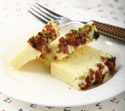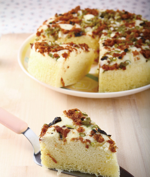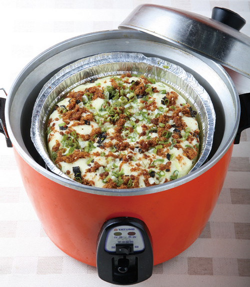 4.将作法3的面糊倒入容器中,再均匀撒上肉松葱花装饰。