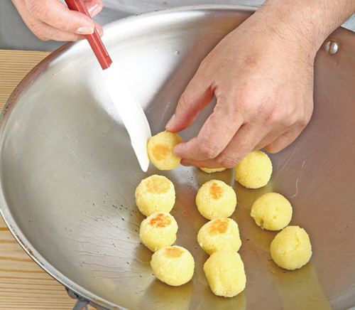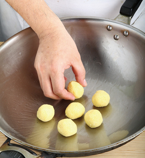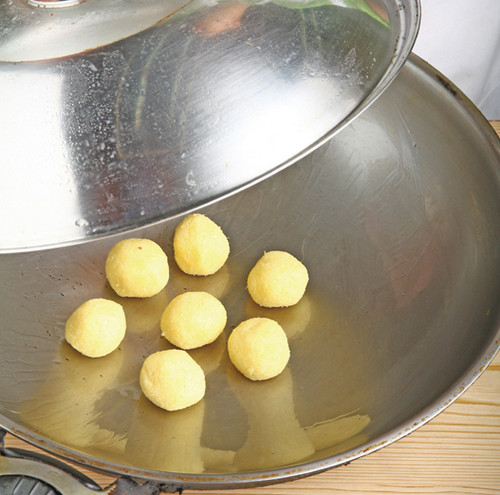 步骤3 将作法2的拌好的椰子粉整型成小球,放入抹上少许油的中华炒锅内,盖上锅盖,开微火。