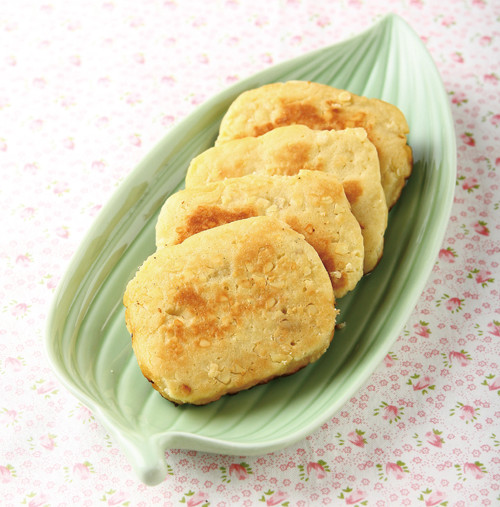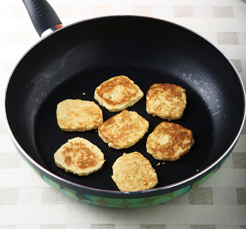 3.取出作法2的面团,切成厚约0.6公分的片状,放入抹上少许油的平底锅。