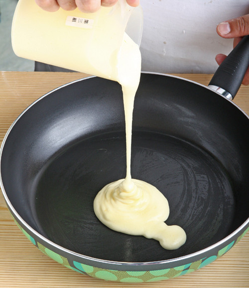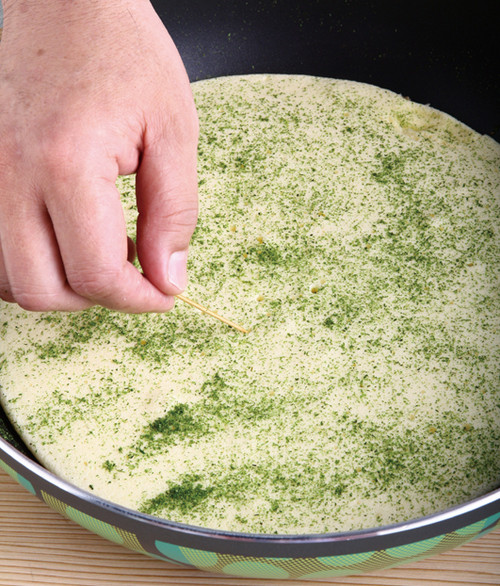 步骤4 平底锅底抹上少许油,倒入作法3约800P的面糊入锅摊平,撒上约1茶匙的海苔粉。