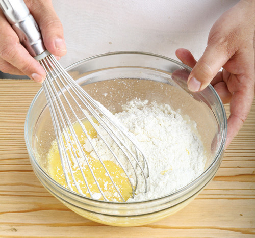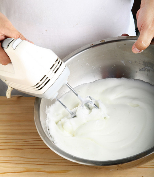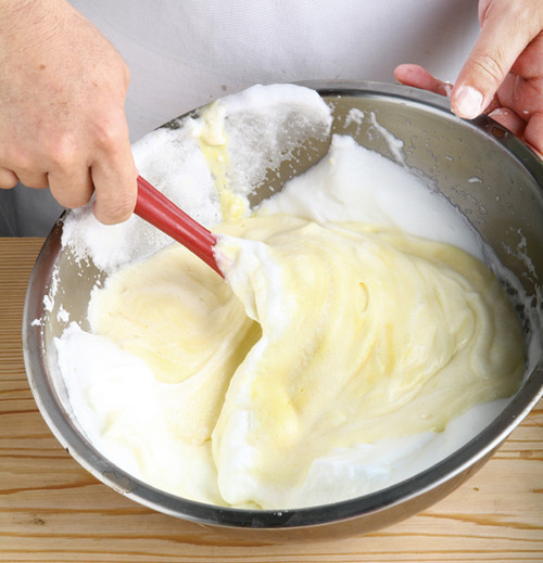 步骤3 取作法2打发的蛋白一半,加入作法1的面糊拌匀后,再倒至剩余的蛋白中充分拌匀即成蛋糕糊。