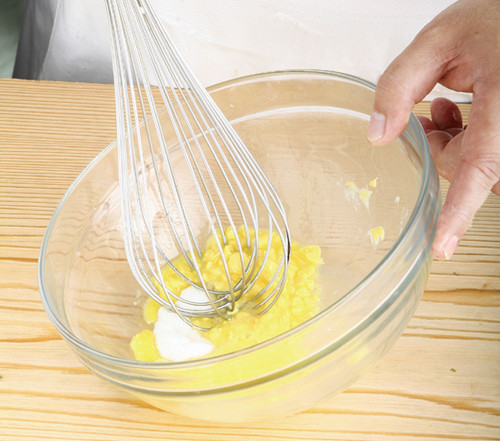 步骤1无盐奶油放入盆中,加入鸡蛋打匀后加入细砂糖打至混合。