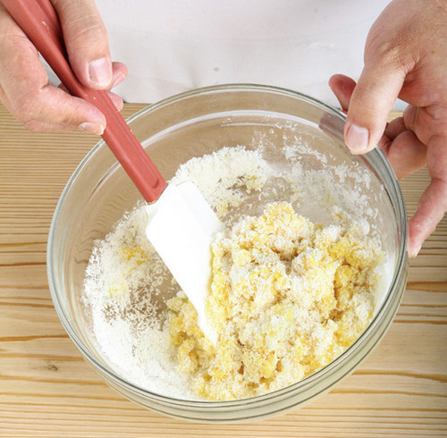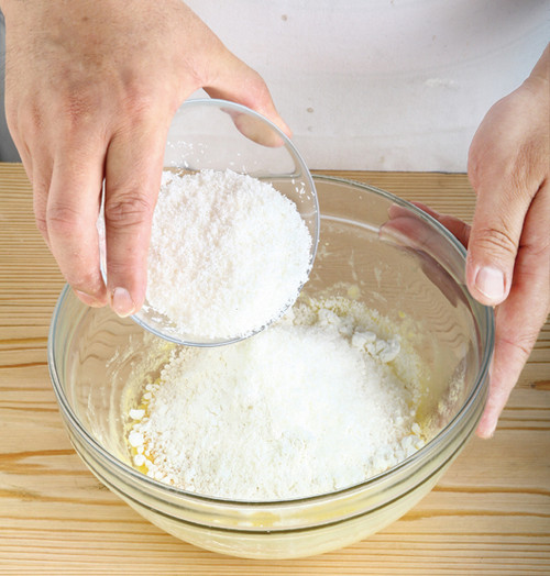 步骤2 再加入椰子粉及低筋面粉后充分拌匀。
