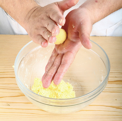 1.无盐奶油和糖粉放入钢盆中拌匀,加入打散的鸡蛋充分拌匀,再加入过筛的低筋面粉及杏仁粒揉匀。