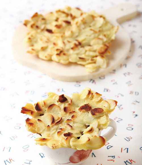 蛋白 80公克、蛋黄 40公克、糖粉120公克、低筋面粉 40公克、玉米粉10公克、无盐奶油40公克、杏仁片150公克