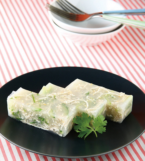 4、待作法3稍冷却后,加入作法1小黄瓜丝、作法2鸡丝、白芝麻一起拌均匀后,即倒入小长方形模型,即放入冰箱冷藏室冷藏固型即可。