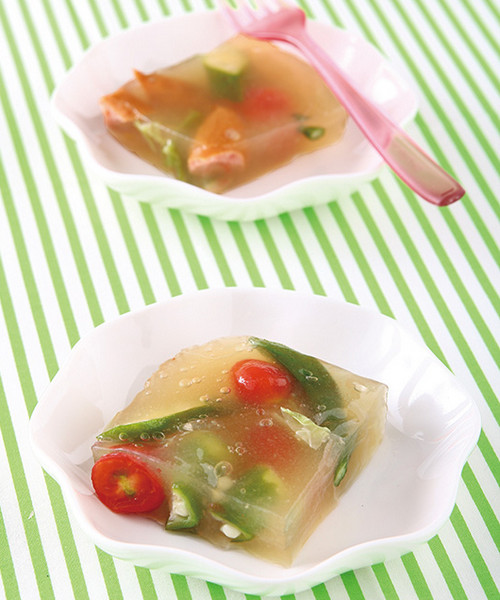 肉冻则是需要花点时间制作,最常见的比如鸡脚冻,是利用熬煮后肉皮产生的胶质冷却后凝结而成,但是较花时间。如果想要快速做成肉冻,可以利用一些辅助材料,像是吉利丁或洋菜粉、寒天粉,凝结后颜色也比较透明漂亮。