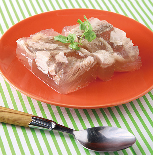 要使肉冻呈现果冻的感觉,除了熬煮肉块时肉质本身所带有的胶质外,也可以运用吉利丁或是洋菜粉来使肉冻凝固,要注意的是加入的份量不要太多,吃起来的感觉才会Q弹。