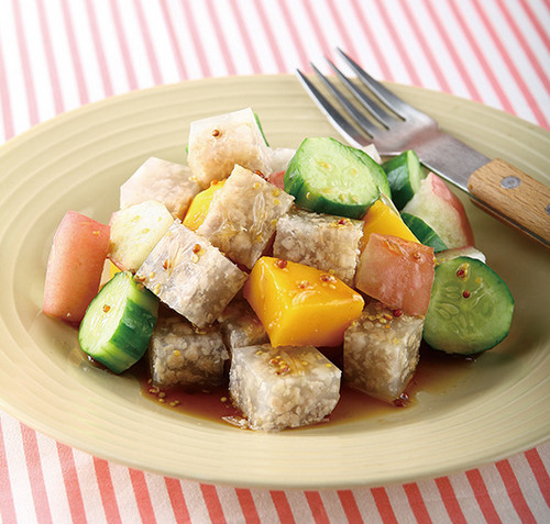 5、取一盘,将作法2小黄瓜块、作法4肉冻块与芒果丁块、莲雾丁块放入盘中,再淋上和风芥末籽酱即可。