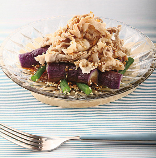 五花薄片肉150公克、茄子1支、长豆2支、白芝麻适量、辛辣淋酱适量