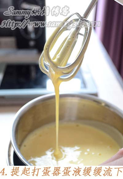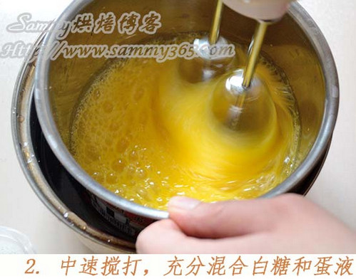 2、打全蛋时,用搅拌器先用中速打二分钟,把蛋和糖打匀后再改快速打成乳白色,用手指勾起蛋液不会快速流下,此时再改中速打数分钟将不均匀的气囊打碎,使打入的空气囊能大小均匀的分布在每一部分。(此时用搅拌头垂直拉起,蛋液会在搅拌头上停留一下下后往下掉落,而且蛋液不会立即与盆中的蛋液融合不见;如果一拉起搅拌头,蛋液跟瀑布一样像一条柱子快速掉落而没有半分的停留,那就是打得还不够。