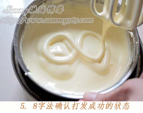 3. 全蛋打发成功与否的判定标准与蛋白打发不同,对于全蛋我们一般使用“8字法”验证是否打发到位。即提起打蛋器,用搅拌头上落下的蛋液画8字,如果8字可以清晰的保持在蛋糊表面一段时间不会消失,说明打发到位了。