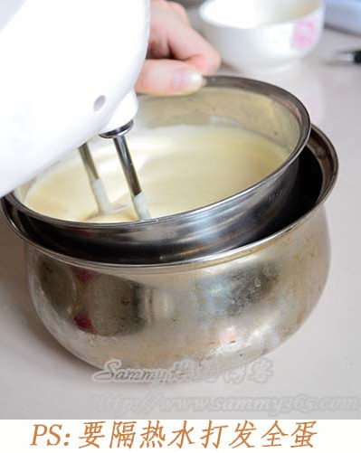 2. 全蛋打发最适宜的温度在40度左右,这时打发效率最高。所以我们一般是将打蛋盆座到热水盆中,隔热水打发,热水温度控制在50度左右(手摸上去有些烫)