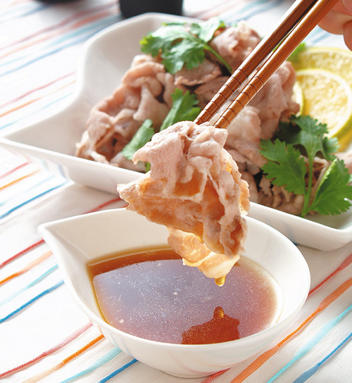 4、薄肉片汆烫至肉片变白后捞起,盛入盘中,再淋上作法3的酱汁即可。