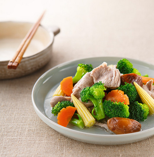B 鲜香菇5朵、青花椰菜100公 克、红萝卜30公克、玉米笋40 公克