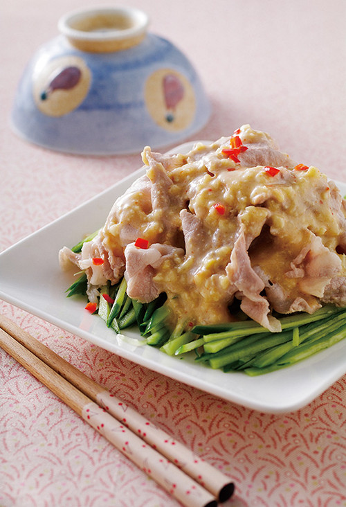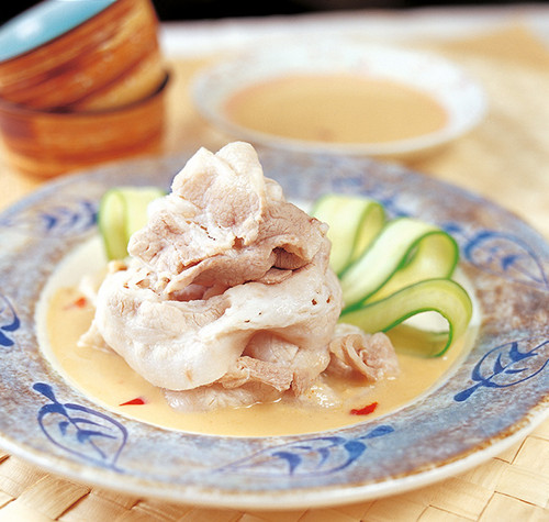 5、将小黄瓜片呈放射状摆盘,放上涮好的猪肉片,即可沾取作法3的酱汁或将酱汁淋在肉片上享用。