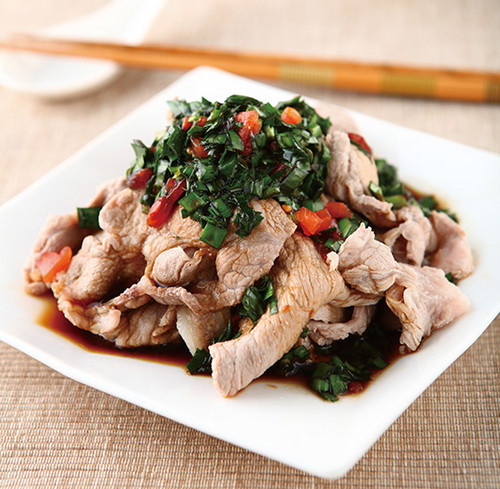 取一锅,倒入1/3锅的水煮至沸腾,放入梅花肉片汆烫至熟,捞起沥干排盘,淋上作法2的蒜茸酱,再摆 上少许嫩姜丝即可。
