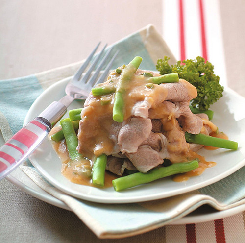 4、作法2的四季豆、梅花肉片盛入盘中,将作法3的酱汁淋入即可。