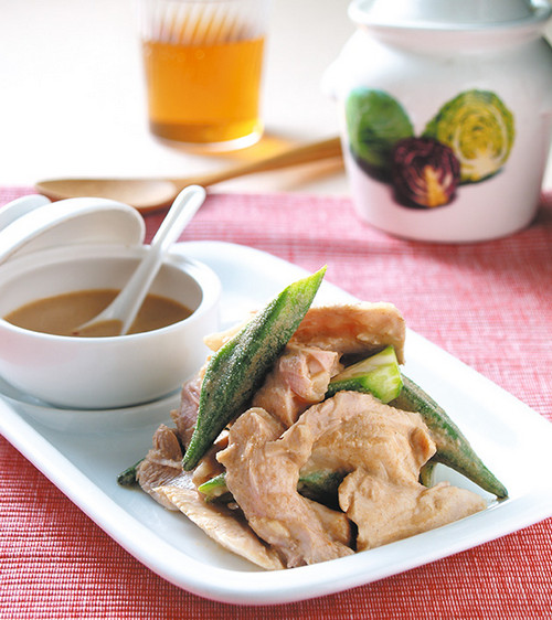 4、将作法1的鸡腿薄肉片、作法2的秋葵混合后盛盘,食用时淋 上作法3的芝麻酱汁即可。