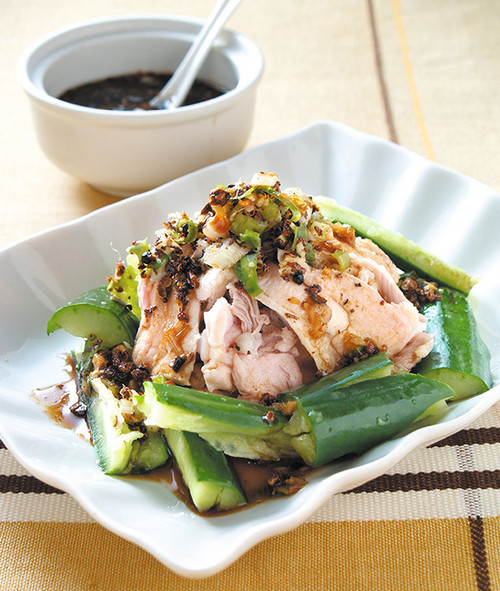 4、鸡腿肉片放入沸水中汆烫浸熟, 捞起,置于作法3的小黄瓜块上。