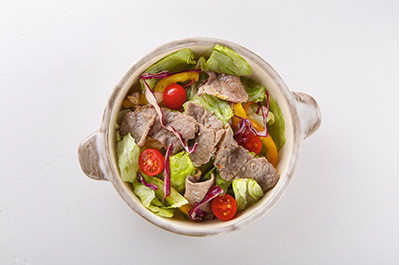 3、将材料B的所有蔬菜混合盛盘,淋入混合的调味料拌匀,再摆上作法2的牛肉片即可。