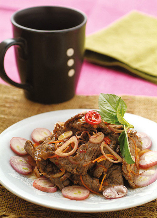 牛肉片300公克、红葱头40公克、柠 檬1/4颗、红辣椒1根