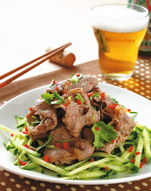 4、取一碗,放入作法2的牛肉片与所有调味料拌匀,再加入作法3的葱花、香菜碎、红辣椒末拌匀,摆在作法3的小黄瓜丝上即可。