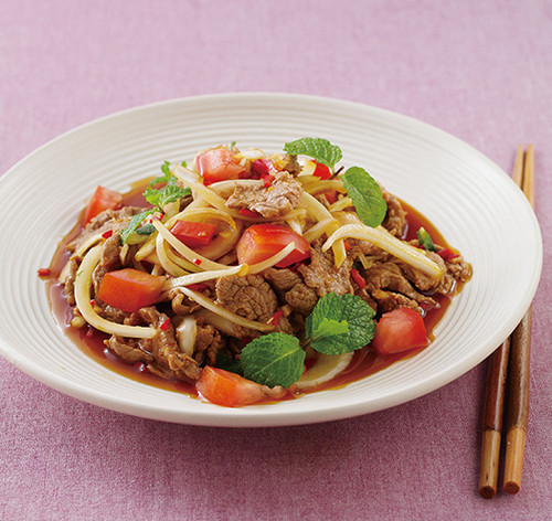 牛肉片120公克、蒜末20公克、红辣椒丝20公克、洋葱丝50公克、薄荷叶5片