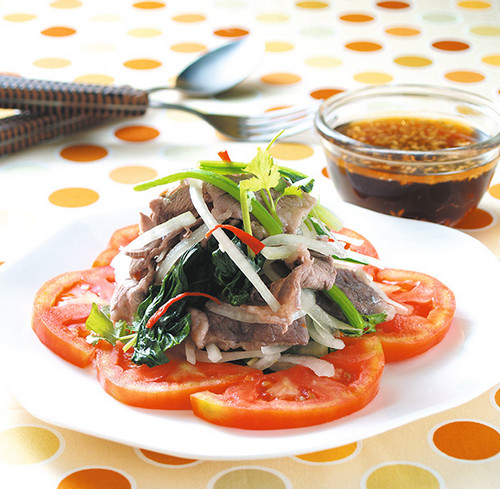 4、将作法2的红葱头片、红辣椒碎、柠檬薄片、调味料A的鱼露及细砂糖、作法1的泰式酸甜辣酱搅拌均匀成淋酱,倒入作法3的牛肉片上即可。