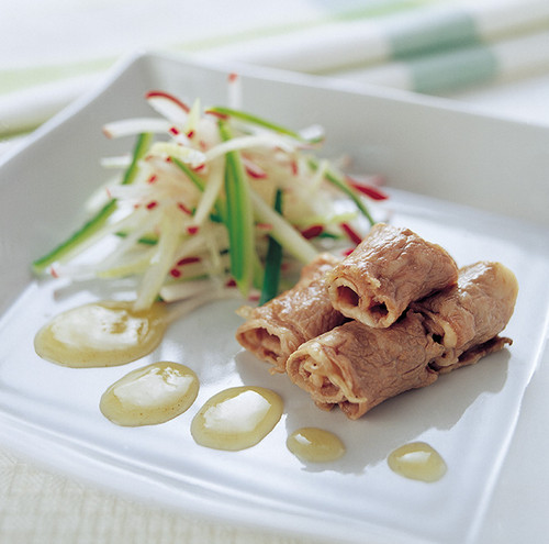 4、牛肉薄片汆烫至个人喜好的熟度,再卷成肉卷排入盘中,放上沥干的作法 1材料,再淋上作法3的橙醋冻即可。
