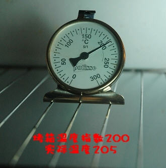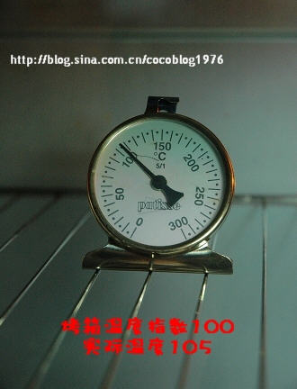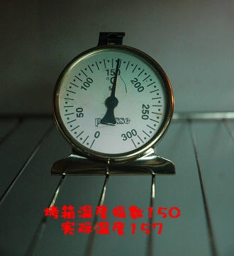 我的烤箱试的时候用的150度,实际测量温度是180度,说明我的烤箱实际温度要比标识高出30度那么多,太可怕了。难怪刚开始烤东西总是糊掉,害得我只能一刻不停地等在烤箱旁不敢离开,太狼狈了,根本体会不到乐趣。现在我只要按配方当中的温度减去30度来调节我的温度纽就万事大吉(如果你的测出来偏低那就要做加法啦),一般按照配方的烘烤时间都没太大问题,可以该干啥干啥,听到“叮”声来取出美味作品就可以了,哈哈,多美妙的事。